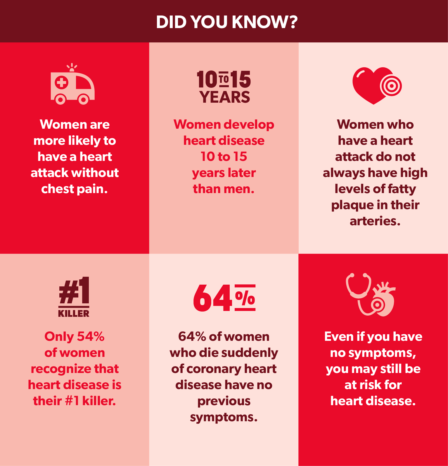 Heart disease kills more women each year than ALL cancers, chronic lung disease, pneumonia, diabetes, traffic accidents and AIDS combined.